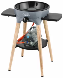 Der CADAC Citi Chef 40 ist auch als freistehende Station erhältlich. Mit hochwertigen und trendigen Holz-Standbeinen, bekommt der kompakte Campinggrill die ideale Arbeitshöhe.