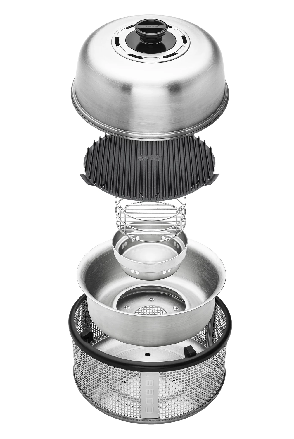 Vor allen in den Details des Aufbaus liegen viele Vorteile. Die Außenhülle ist aus einem speziellen Edelstahlgeflecht gefertigt, welches auch während der Benutzung nicht heiß wird. Im Inneren ist der Cobb Grill mit einer Edelstahl Innenschale ausgestattet, welche mit Hilfe eines Gummiabstandhalters von der Außenhülle entkoppelt ist. So bleibt die Hitze ausschließlich in der Brennerkammer und verhindert das Aufheizen der Außenhülle.
