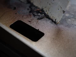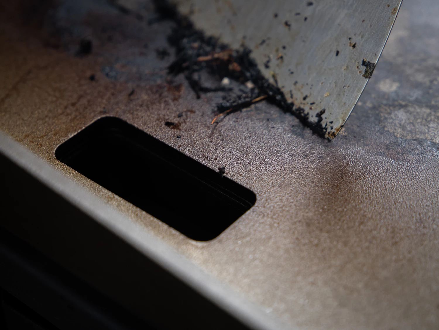 Beim Braten und Aromatisieren auf der Plancha entstehen Fettreste und Krusten, welche hin und wieder während des Grillvorgangs entfernt werden müssen. Damit die Grillfläche schnell und einfach gereinigt werden kann, besitzt die Platte auf der linken Seite, nahe am Rand, eine rechteckige Ablauföffnung, durch welche mit Hilfe eines Spatels die Reste einfach in den darunter sitzenden Auffangbehälter geschoben werden können. Der Behälter fasst ca. 300 ml und kann zum Entleeren einfach seitlich herausgenommen werden.