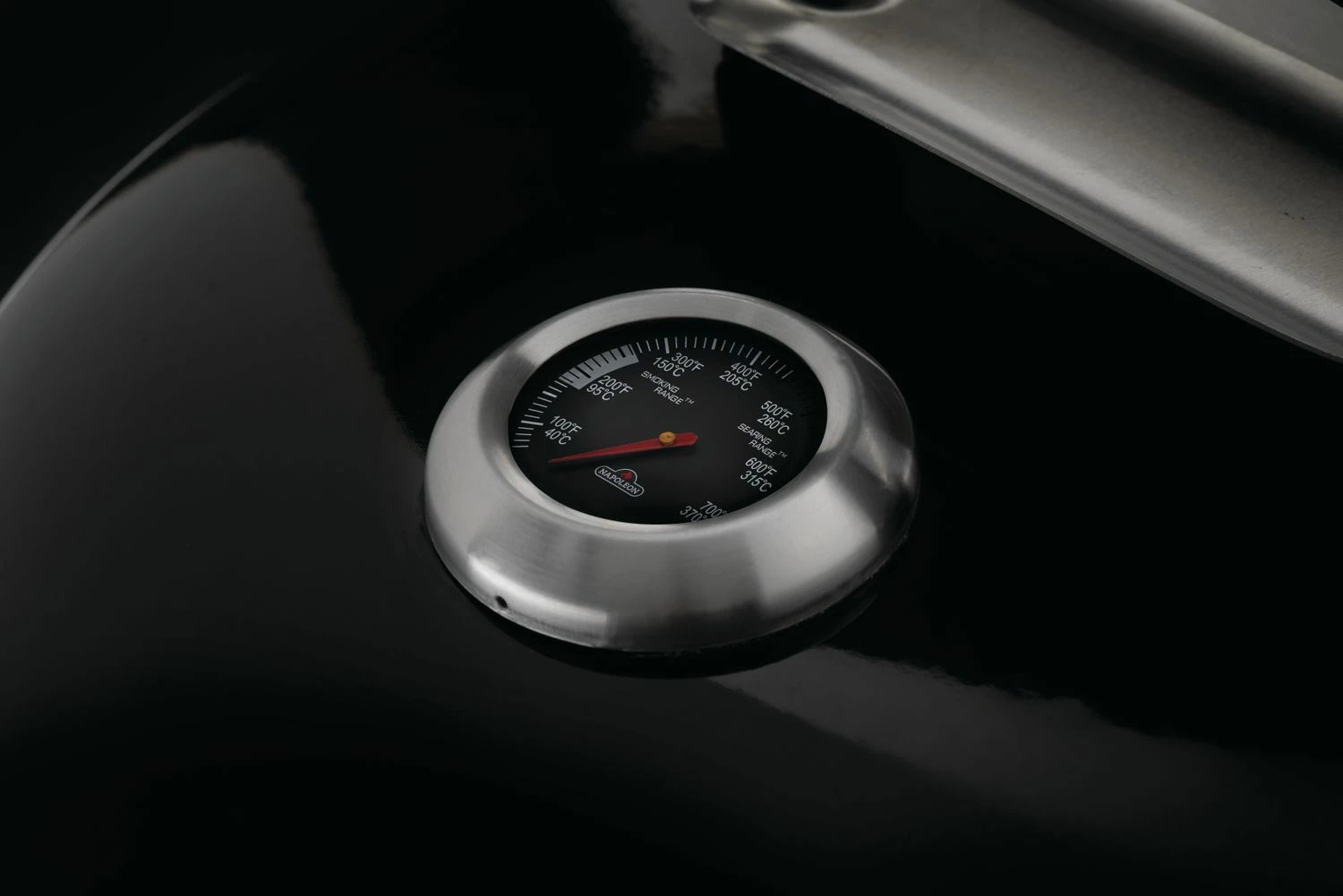 Der Deckel beherbergt eine ganze Reihe von gut durchdachten Funktionen. Zum einfachen Ablesen der Garraumtemperatur befindet sich im Deckel – gleich neben dem Abluftschieber – ein Thermometer. Auf der Oberseite des Deckels ist ein stabiler Griff mit eingebautem Hitzeschutz montiert. Wenn Sie auf der GrillflĂ€che mit beiden HĂ€nden arbeiten mĂŒssen, kann der Deckel platzsparend an die Seite der Kugel gehĂ€ngt werden.