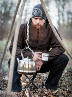 Eine angenehme und sichere Handhabung ermöglicht der dreifach gebogene, austarierte Henkel, mit dessen Hilfe sich der Kessel auch problemlos über einer Feuerstelle aufhängen und zum Transport am Rucksack befestigen lässt.