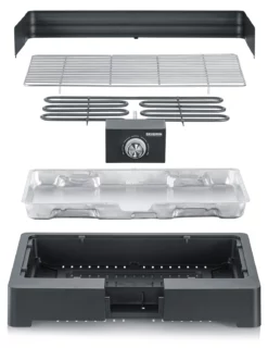 FĂĽr die Reinigung des Grills ist es besonders praktisch, dass sich Teile wie das Windschutzblech, der Grillrost, das Heizelement und die Wasserschale einfach entnehmen lassen.